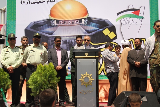 معاون سیاسی انتظامی فرماندار شهرستان پردیس نیز در جمع راهپیمایان در خصوص وظیفه ما در قبال مردم مظلوم فلسطین اشغالی گفت: مردم مظلوم فلسطین امروز تحت سختترین شرایط انسانی قرار دارند و از هوا و زمین گلولههای استکبار جهانی و رژیم صهیونیستی بر سر آنها میبارد و مظلومانه در حال دفاع از حیثیت و ناموس کشورهای مسلمان هستند.